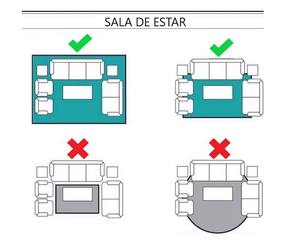 Na sala de estar, nos baseamos pela medida do sofá,pois o tapete sempre tem que ser maior que sofá sobrando de 15 a 30cm de cada lado do sofá e apartir de 30cm embaixo do sofá, se neste ambiente também tiver poltronas e outros móveis que compõe o ambiente, o ideal é que essas peças também fiquem em cima do tapete. Porque o tapete tem função definir o ambiente e ampliá-lo.