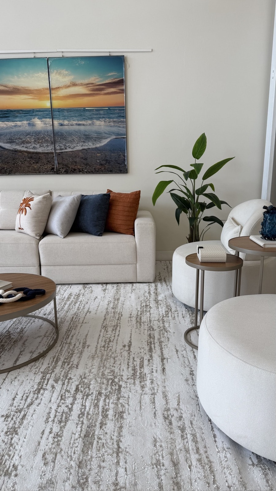Na sala de estar, nos baseamos pela medida do sofá, pois o tapete sempre tem que ser maior que sofá sobrando de 15 a 30cm de cada lado do sofá e a partir de 30cm embaixo do sofá, se neste ambiente também tiver poltronas e outros móveis que compõe o ambiente, o ideal é que essas peças também fiquem em cima do tapete. Porque o tapete tem função definir o ambiente e ampliá-lo.
