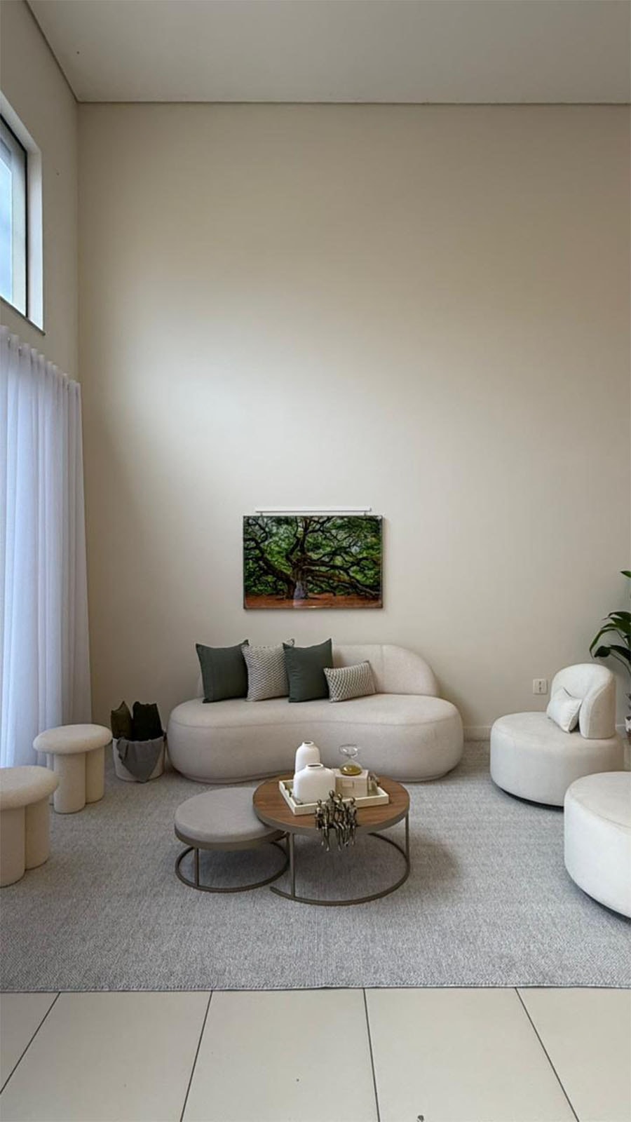 Na sala de estar, nos baseamos pela medida do sofá, pois o tapete sempre tem que ser maior que sofá sobrando de 15 a 30cm de cada lado do sofá e a partir de 30cm embaixo do sofá, se neste ambiente também tiver poltronas e outros móveis que compõe o ambiente, o ideal é que essas peças também fiquem em cima do tapete. Porque o tapete tem função definir o ambiente e ampliá-lo.