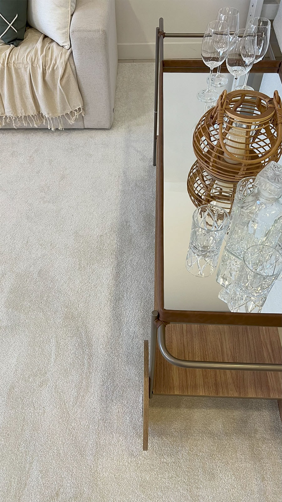 Na sala de estar, nos baseamos pela medida do sofá, pois o tapete sempre tem que ser maior que sofá sobrando de 15 a 30cm de cada lado do sofá e a partir de 30cm embaixo do sofá, se neste ambiente também tiver poltronas e outros móveis que compõe o ambiente, o ideal é que essas peças também fiquem em cima do tapete. Porque o tapete tem função definir o ambiente e ampliá-lo.