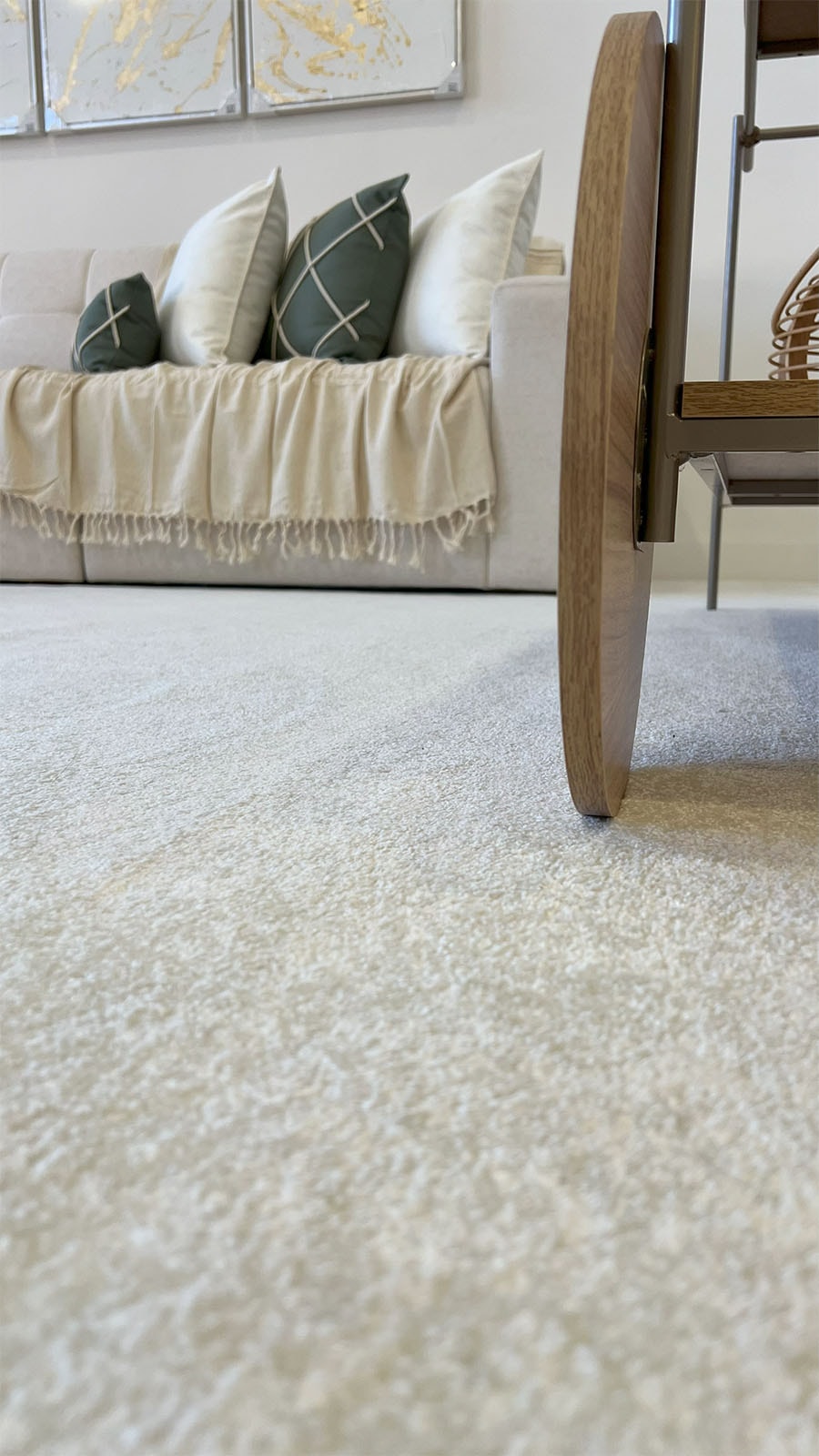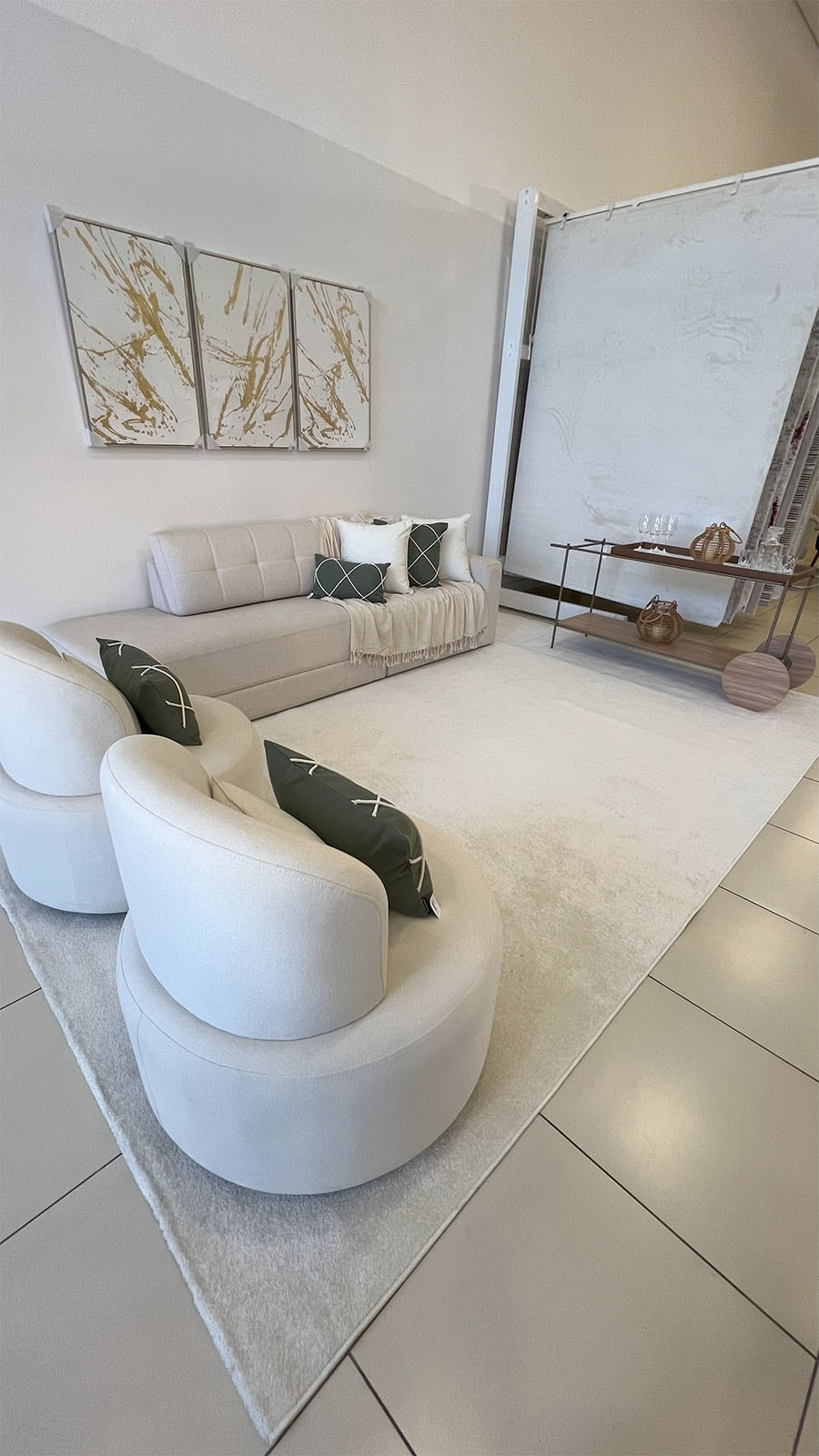 Na sala de estar, nos baseamos pela medida do sofá, pois o tapete sempre tem que ser maior que sofá sobrando de 15 a 30cm de cada lado do sofá e a partir de 30cm embaixo do sofá, se neste ambiente também tiver poltronas e outros móveis que compõe o ambiente, o ideal é que essas peças também fiquem em cima do tapete. Porque o tapete tem função definir o ambiente e ampliá-lo.