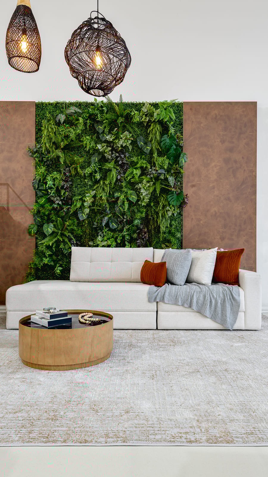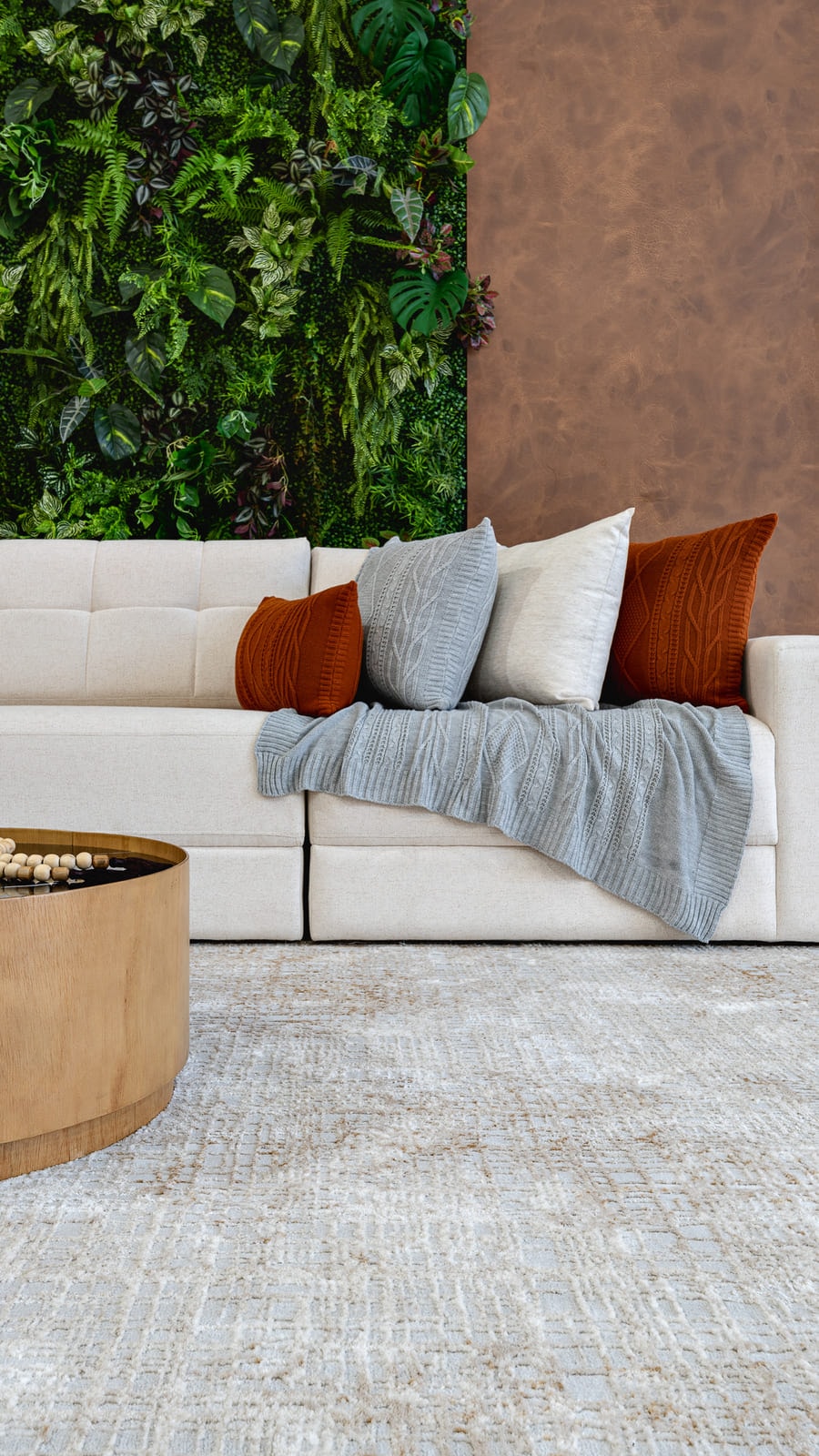 Na sala de estar, nos baseamos pela medida do sofá, pois o tapete sempre tem que ser maior que sofá sobrando de 15 a 30cm de cada lado do sofá e a partir de 30cm embaixo do sofá, se neste ambiente também tiver poltronas e outros móveis que compõe o ambiente, o ideal é que essas peças também fiquem em cima do tapete. Porque o tapete tem função definir o ambiente e ampliá-lo.